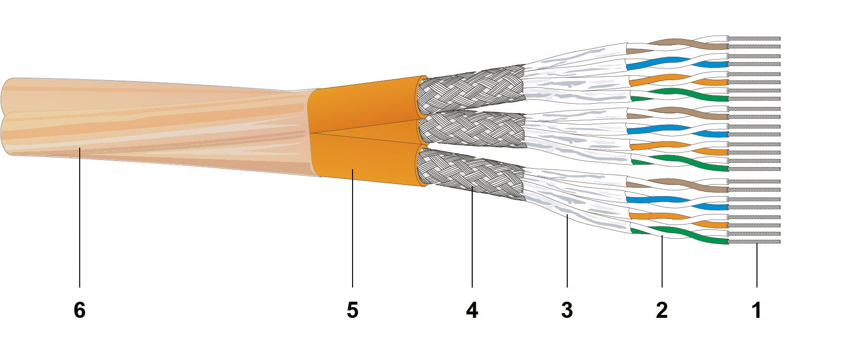 Elektrisch en mechanisch superieure Cat.7 patchkabel – overtreft de eisen van ISO/IEC 11801, IEC 61156-6, EN 50173-1 en EN 50288-4-2. Uitstekend afschermingseffect als gevolg van individueel afgeschermde paren en een globale kopervlecht. Gemakkelijke identificatie en aansluiting van draden omwille van verschillend gekleurde draden. Compatibel met alle gangbare aansluitmaterialen overeenkomstig EN 50173, ISO/IEC 11801 en 60603-x.