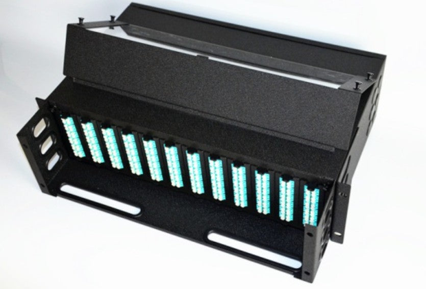 3U MPO Fiber Optic Patch Panel can accommodate 12pcs of MPO cassette modules. MPO cassette modules can install duplex LC adapters with the capacity up to 288 fibers maximum, simplex SC adapters up to 144 fibers maximum and MPO adapters up to 864 fibers maximum.